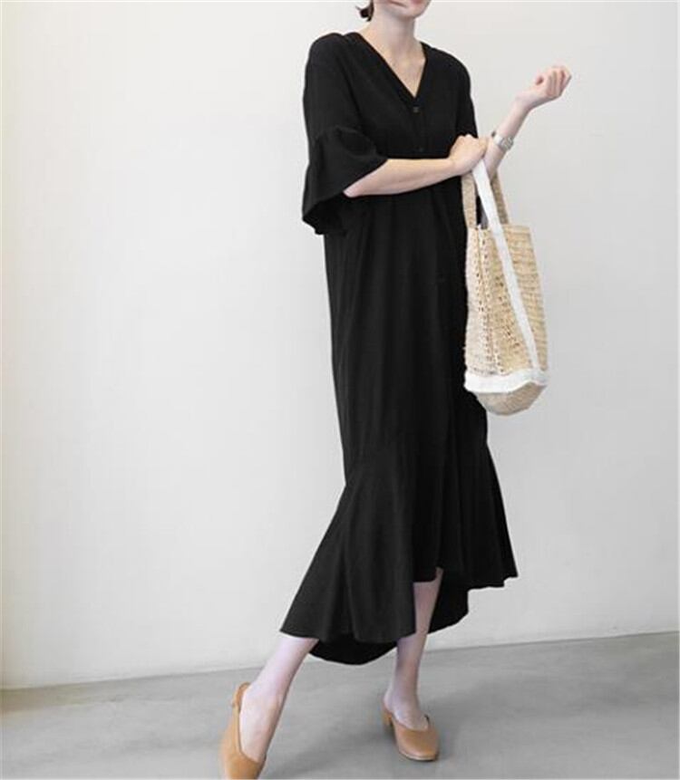 大きいサイズ 綿 Vネック ワンビース 文学 無地 ロングスタイル 気質