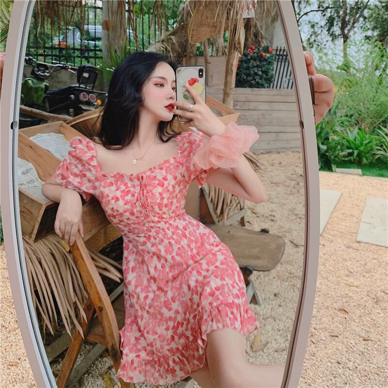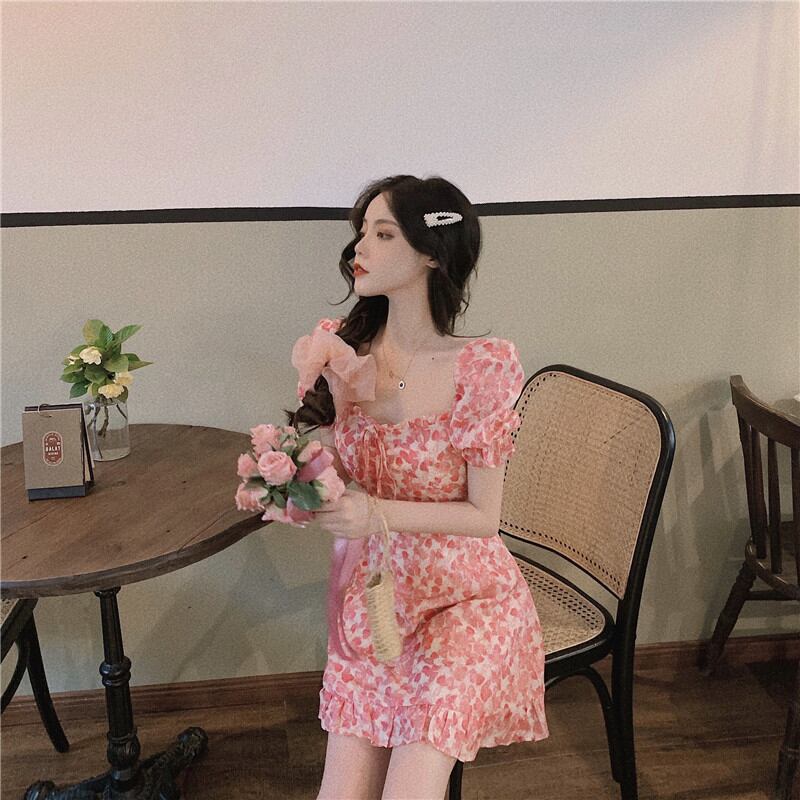 【春季節にピッタリ!】早い者勝ち フリル ワンビース スクエアネック プリント 中・長セクション