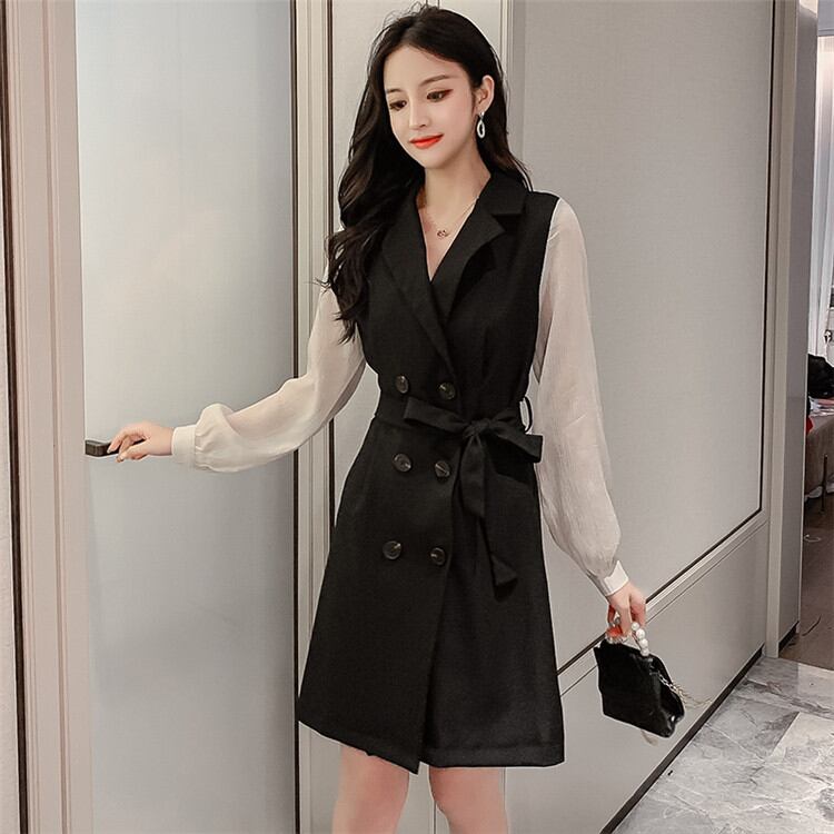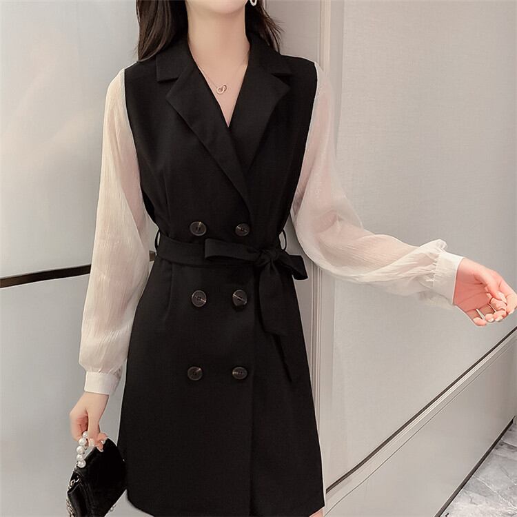 自社生産-高品質!通勤する 秋 新作 ワンピース Aライン フェイク2ピース バンディング スリム