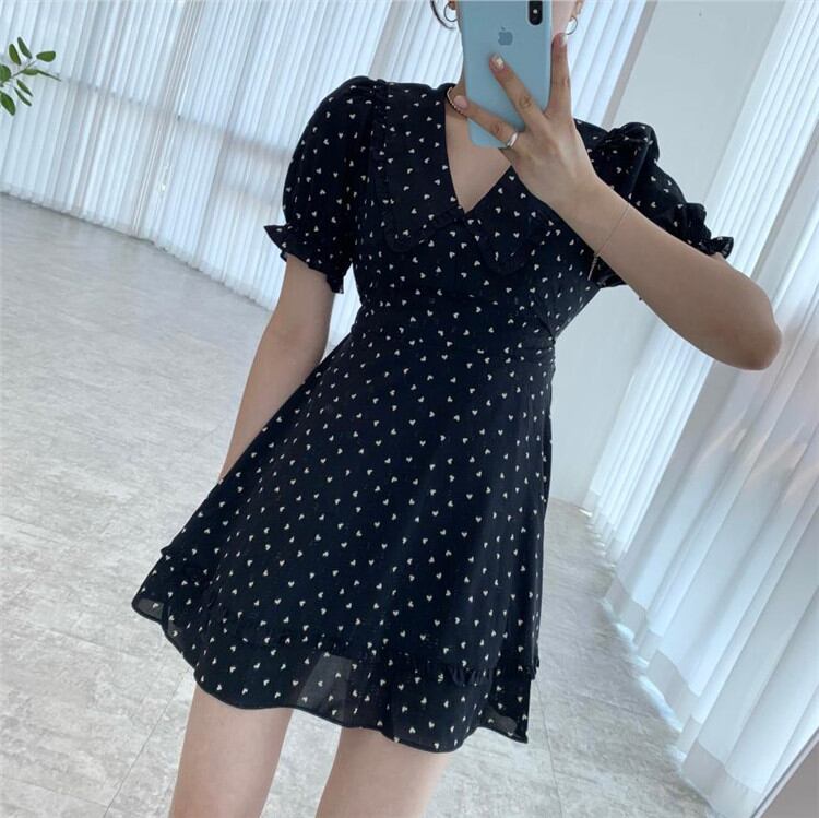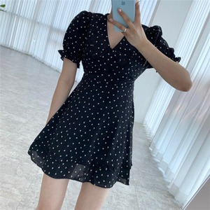 Vネック パフスリーブ ワンピース 韓国 婦人服 サマースタイル sweet系 短いスタイル 小さい新鮮な