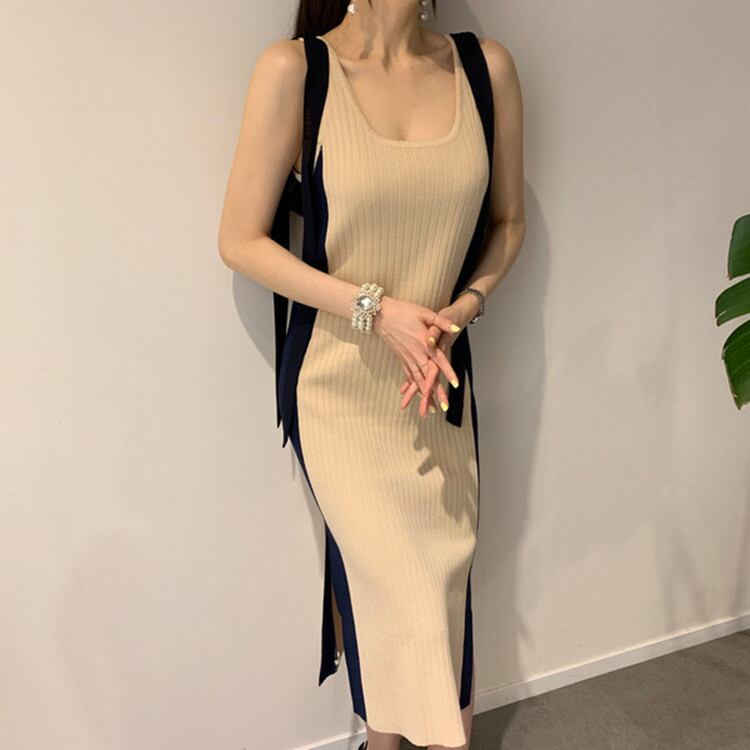 韓国ファッション 蝶結び バンディング スリット 袖なし ベスト ニット ワンビース