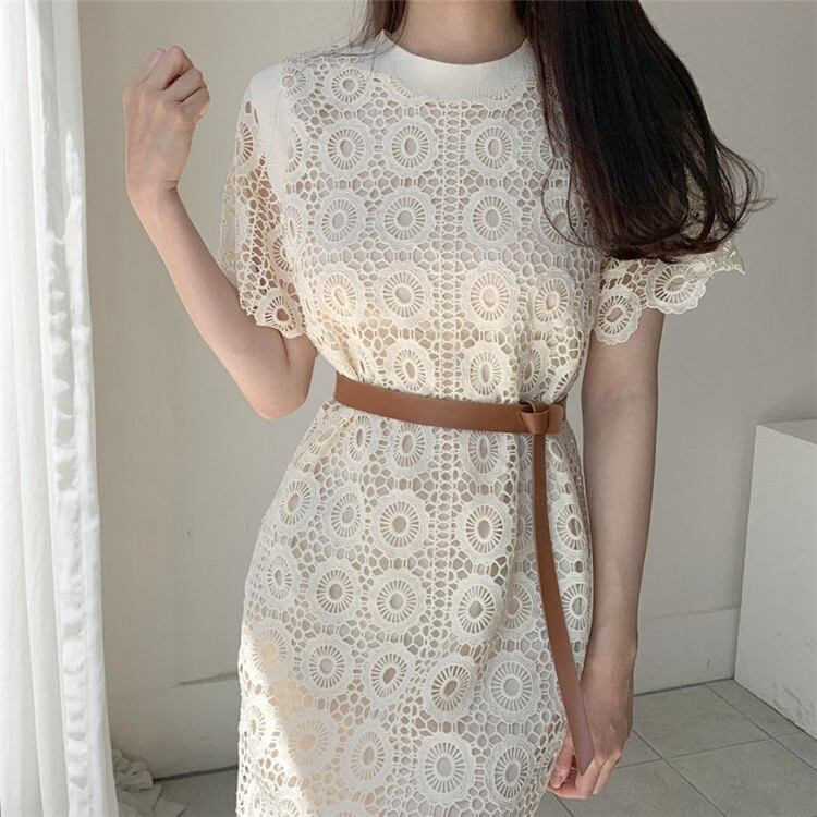 ワンピース クルーネック フックフラワー ホロー レース デザインセンス レース
