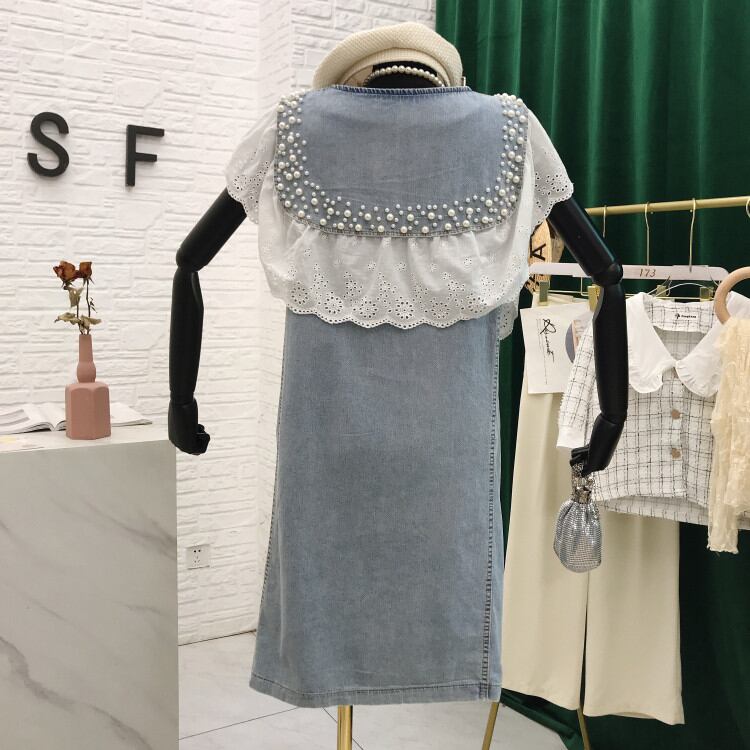 人気カラー再入荷★パール 縫付 デザインセンス デニムワンピース トレンド 袖なし