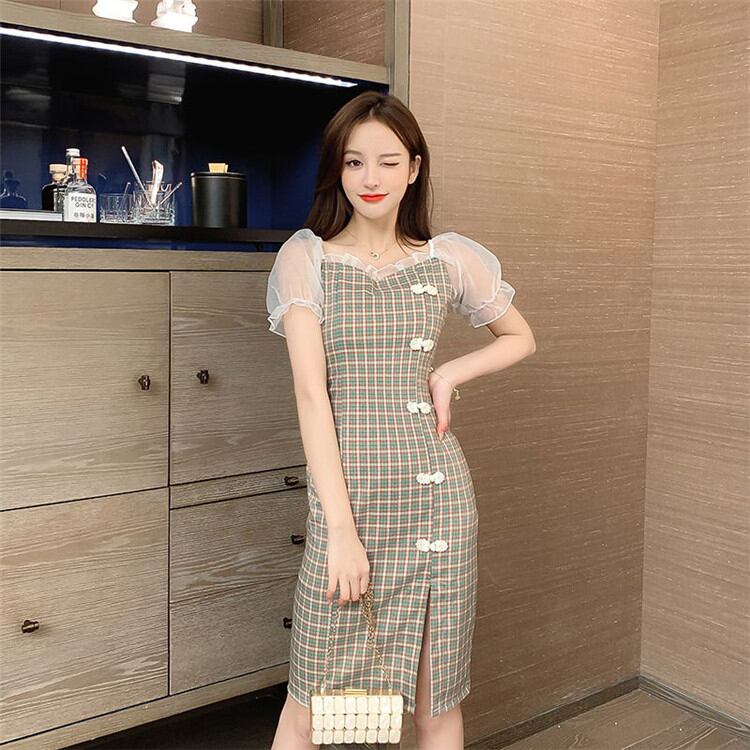 ★韓国大人気 デザイン★夏 スリム 気高い チェック柄 ワンピース スクエアネック パフスリーブ