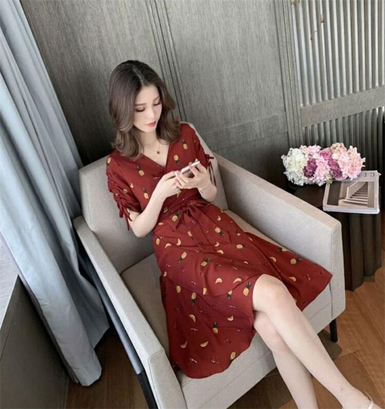早い者勝ち 閨蜜の装い 腰を括る バンディング Vネック ワンピース プリント