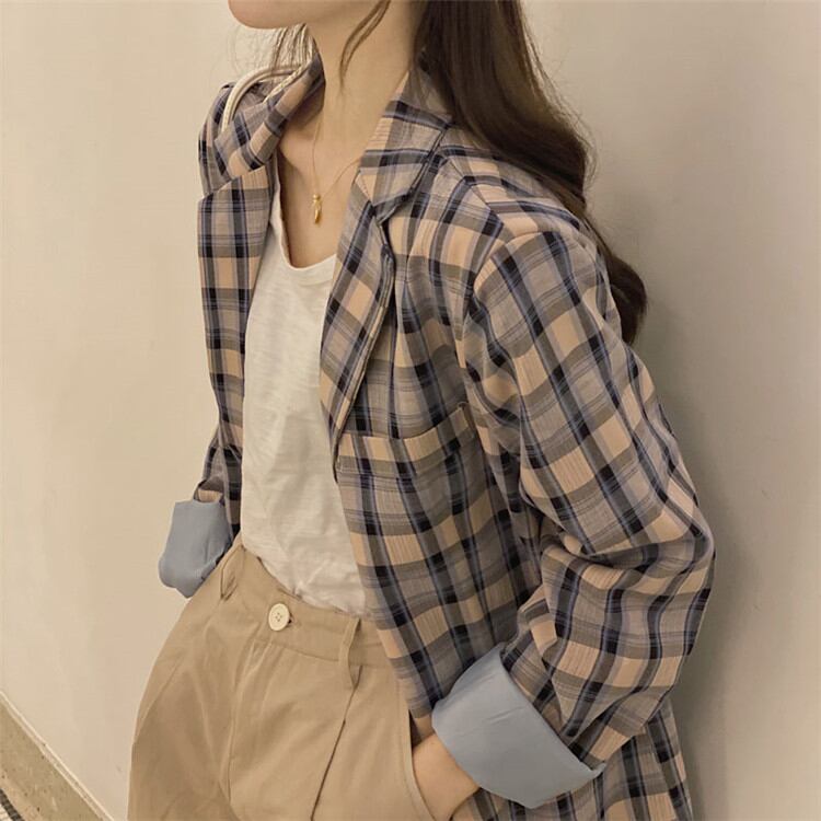 気持ちいい布地 韓国ファッション チェック柄 スーツ ジャケット デザインセンス ファッション 怠惰な風