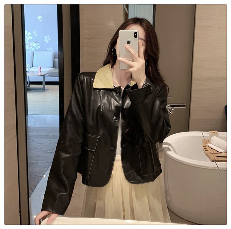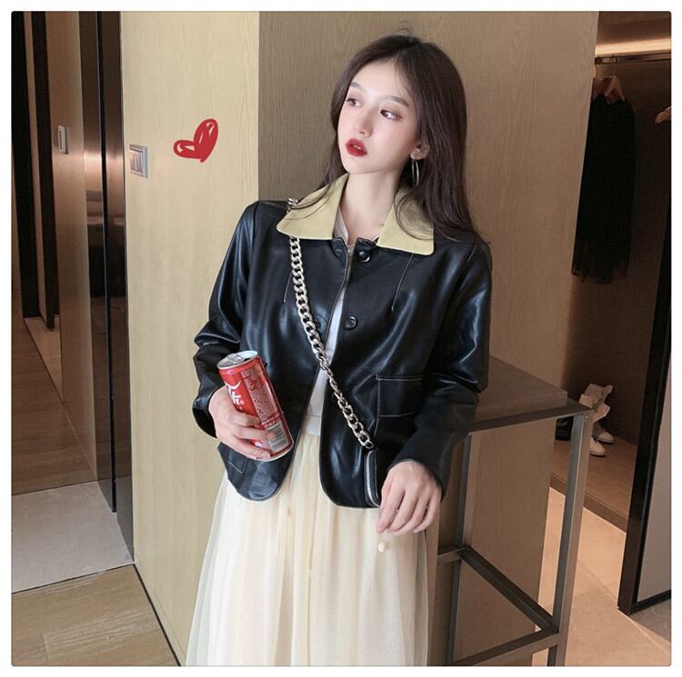 韓国ファッション sweet系 オールマッチ 縫付 ラペル ショート PU レザー ジャケット洗練されたコート
