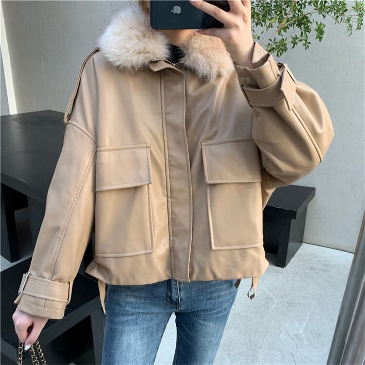 ゆったりするラージファーカラープラスカシミア 暖かさ PU レザー モーターサイクルコート