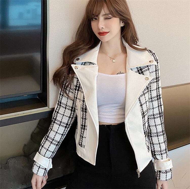 洗練された トップス ジャケットPUレザー 縫付 チェック柄 ツイード 長袖 ショート