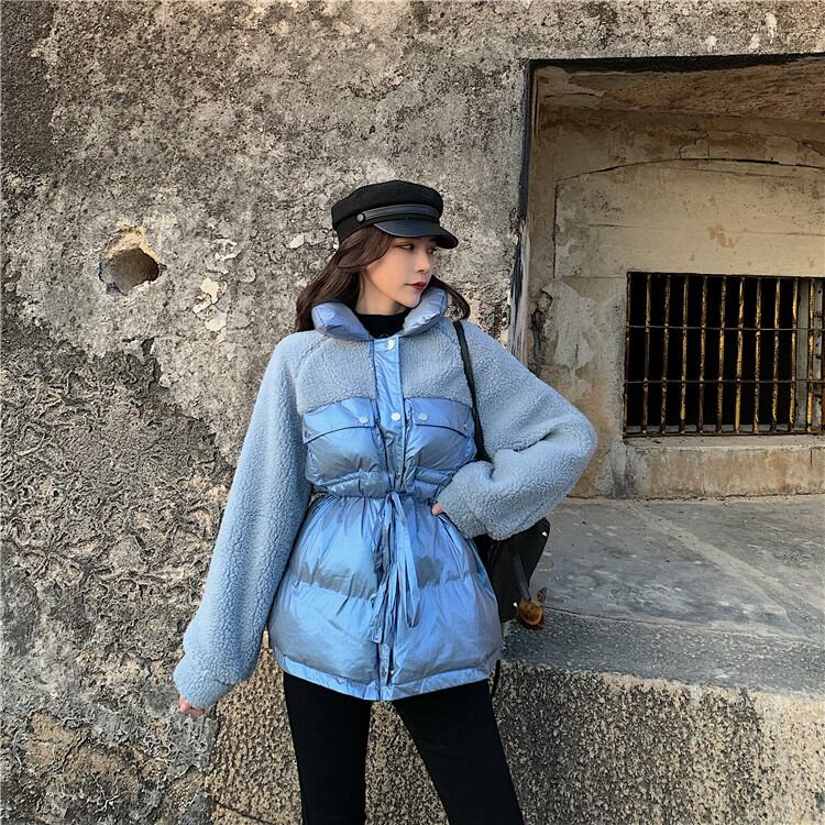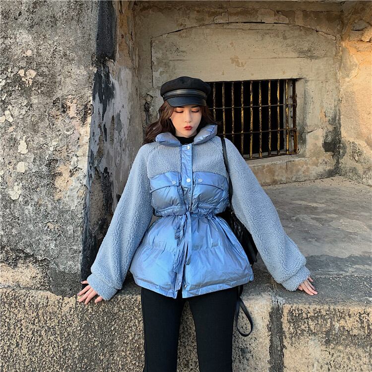通勤する 韓国 冬 中・長セクション コットン 縫付 子羊の髪 毛皮を1つに ジッパー 腰を括る 暖かい