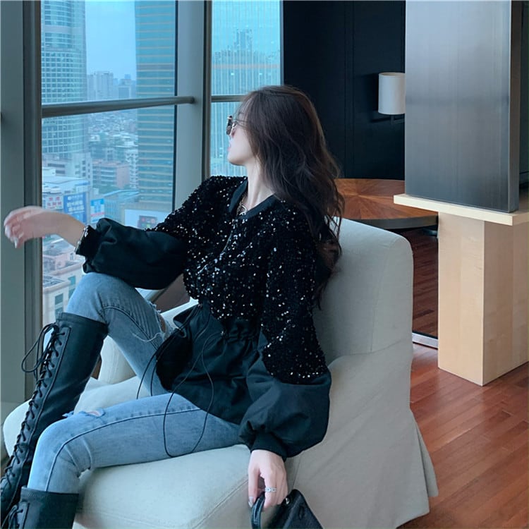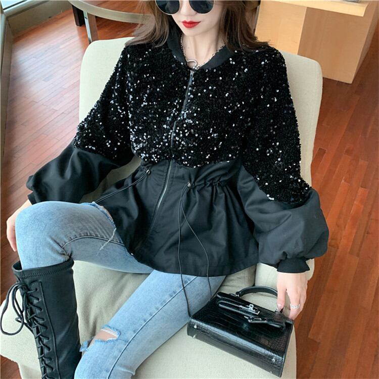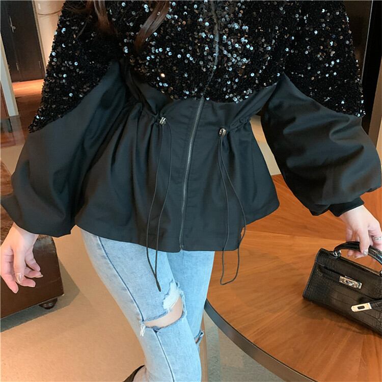 ショットコートレースアップ 引き紐 切り替え ボリューム袖 キラキラ光る スパンコール レトロ調