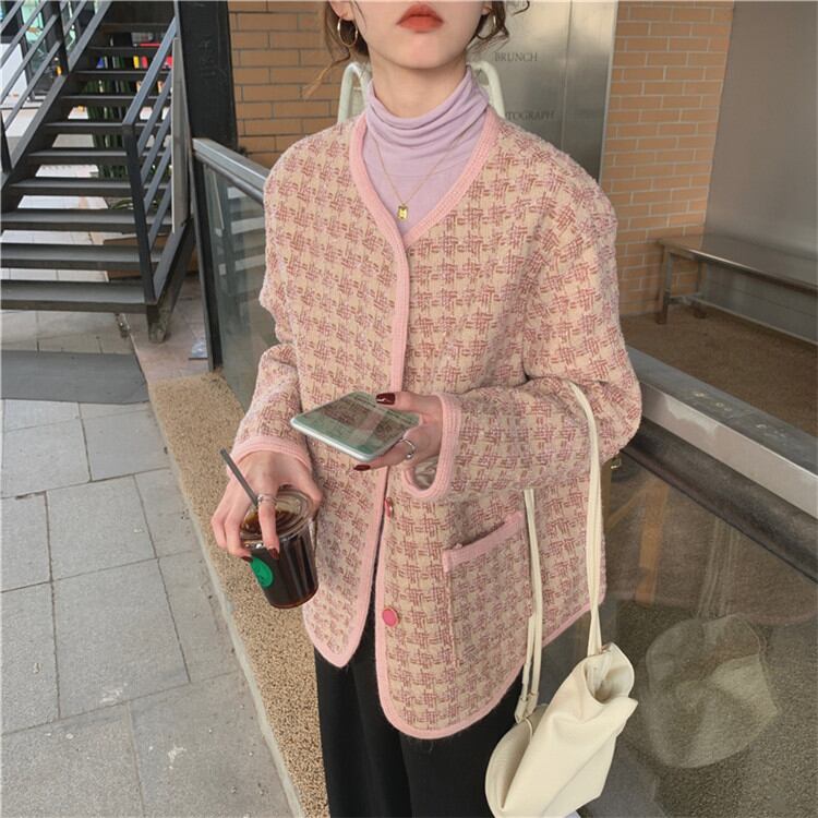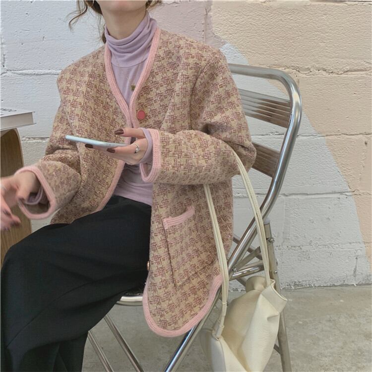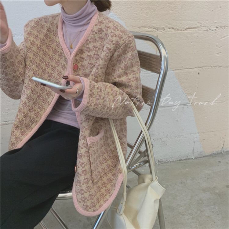 品の良い素材で作る大人旬Style ラウンドネックゆったりするチェック柄コート短いスタイルsweet系