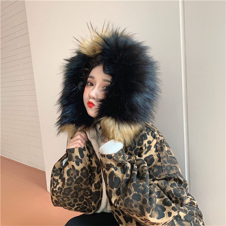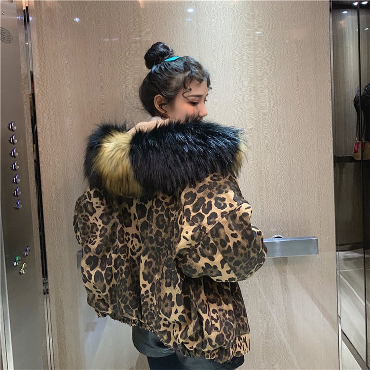 韓国ファッション 短いスタイル 暖かい フード付き 厚手 裏起毛 ヒョウ柄