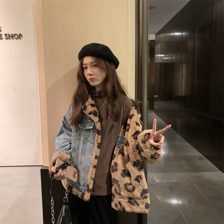 両面着 トレンド デニムコート アウター ジャケット ゆったり 着やせクール 長袖 豹柄の 厚手