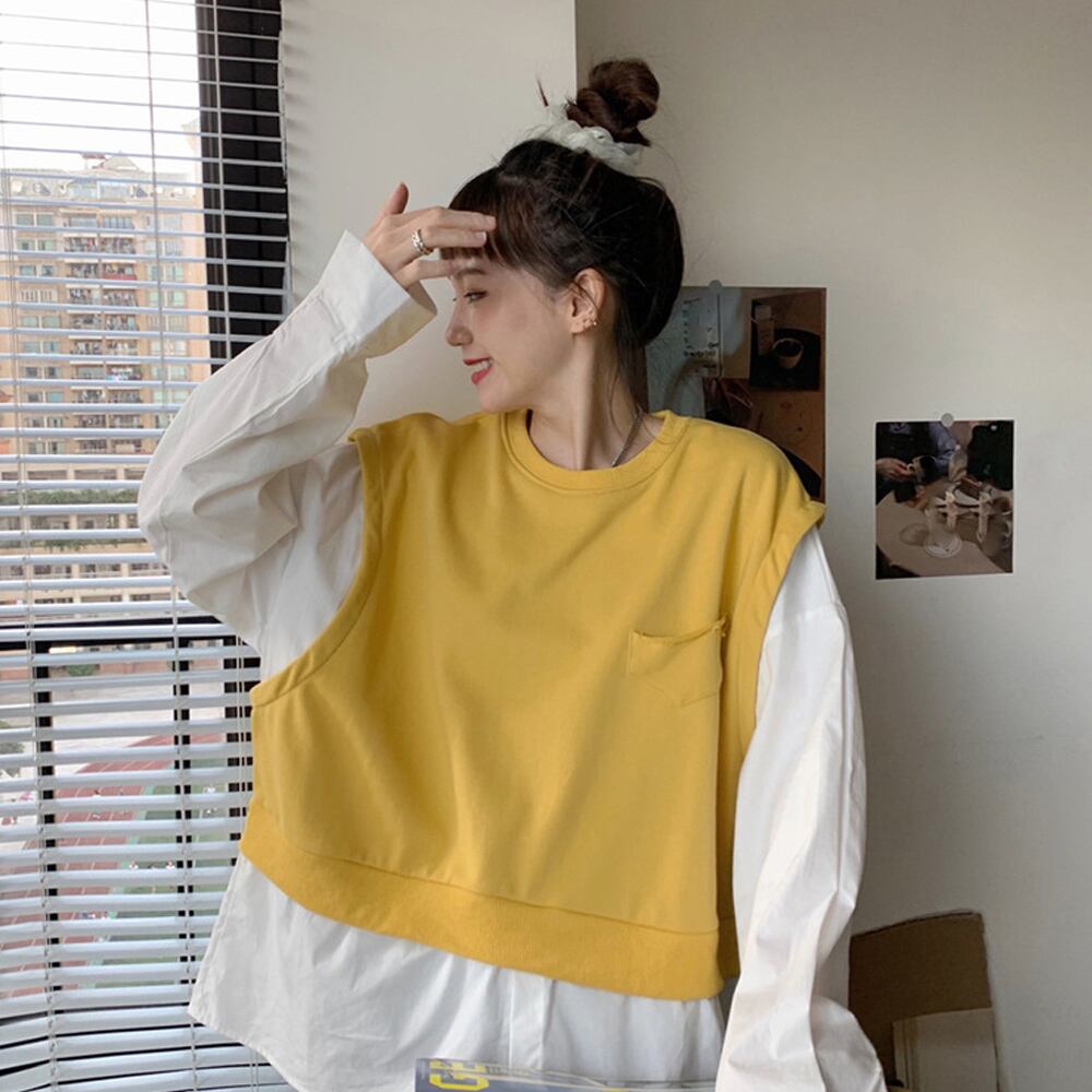 レディース ゆったり 異素材 クールネック シャツドッキング プルオーバー トップス おしゃれ 無地