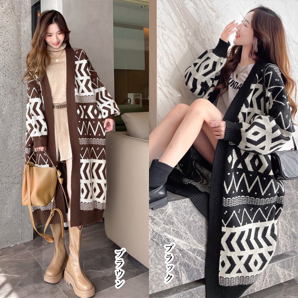 幾何学柄 ニットコーディガン ロング丈 羽織り 中厚手ライトアウター トッパーカーディガン 体型カバー ゆったり レトロ