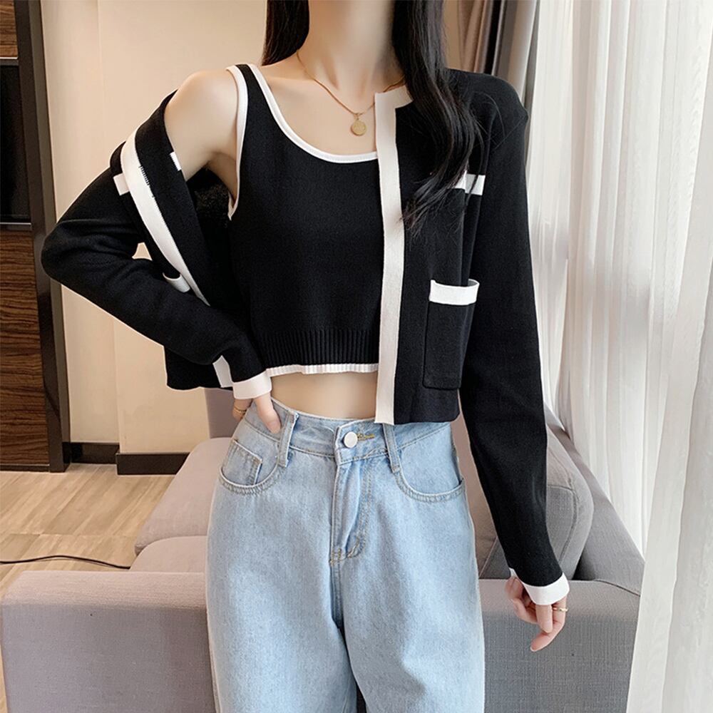 クロップドタンク カジュアルセット 配色 カーディガン
