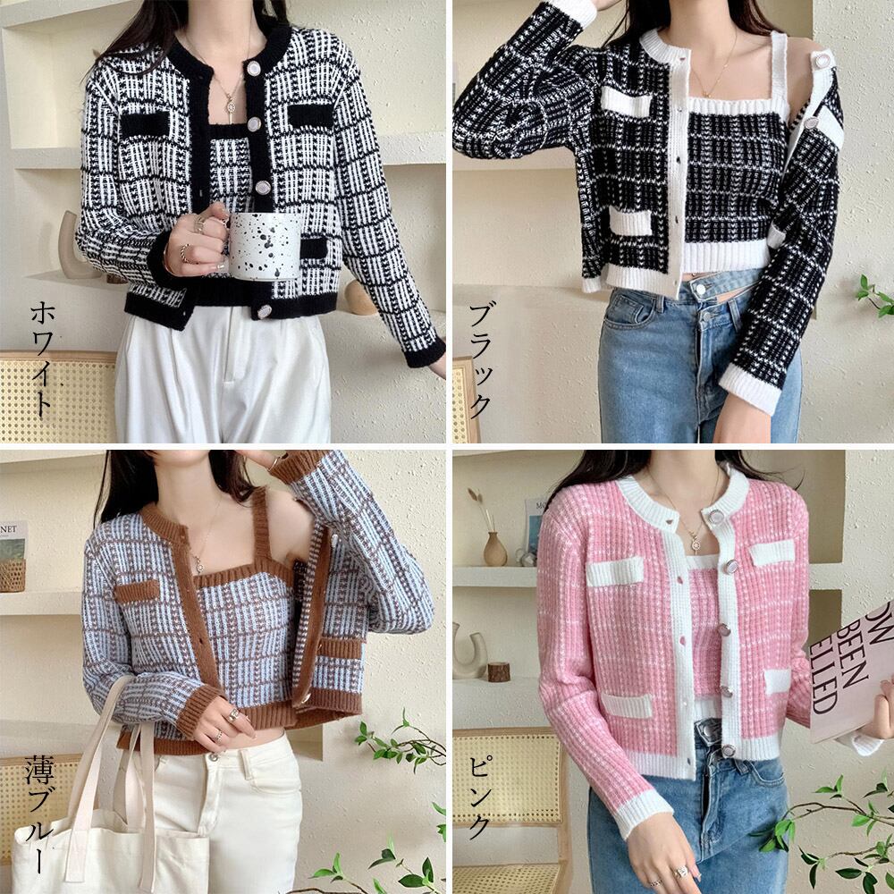 ショート丈 ニットトップス レディース セットアップ 前開き カーディガン おしゃれ キャミソール セクシー ニットソー