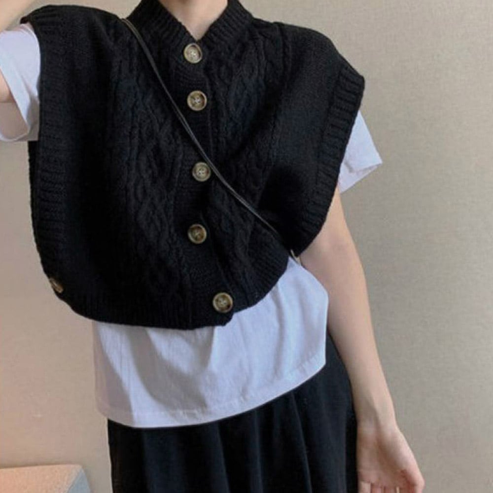 肩幅を広めに仕上げたケーブル編みニットカーディガンベスト