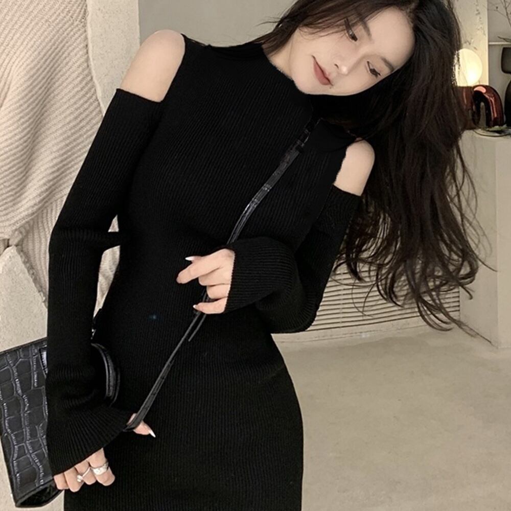 肩開きニットロング セクシー黒 韓国風 ショルダーカット秋