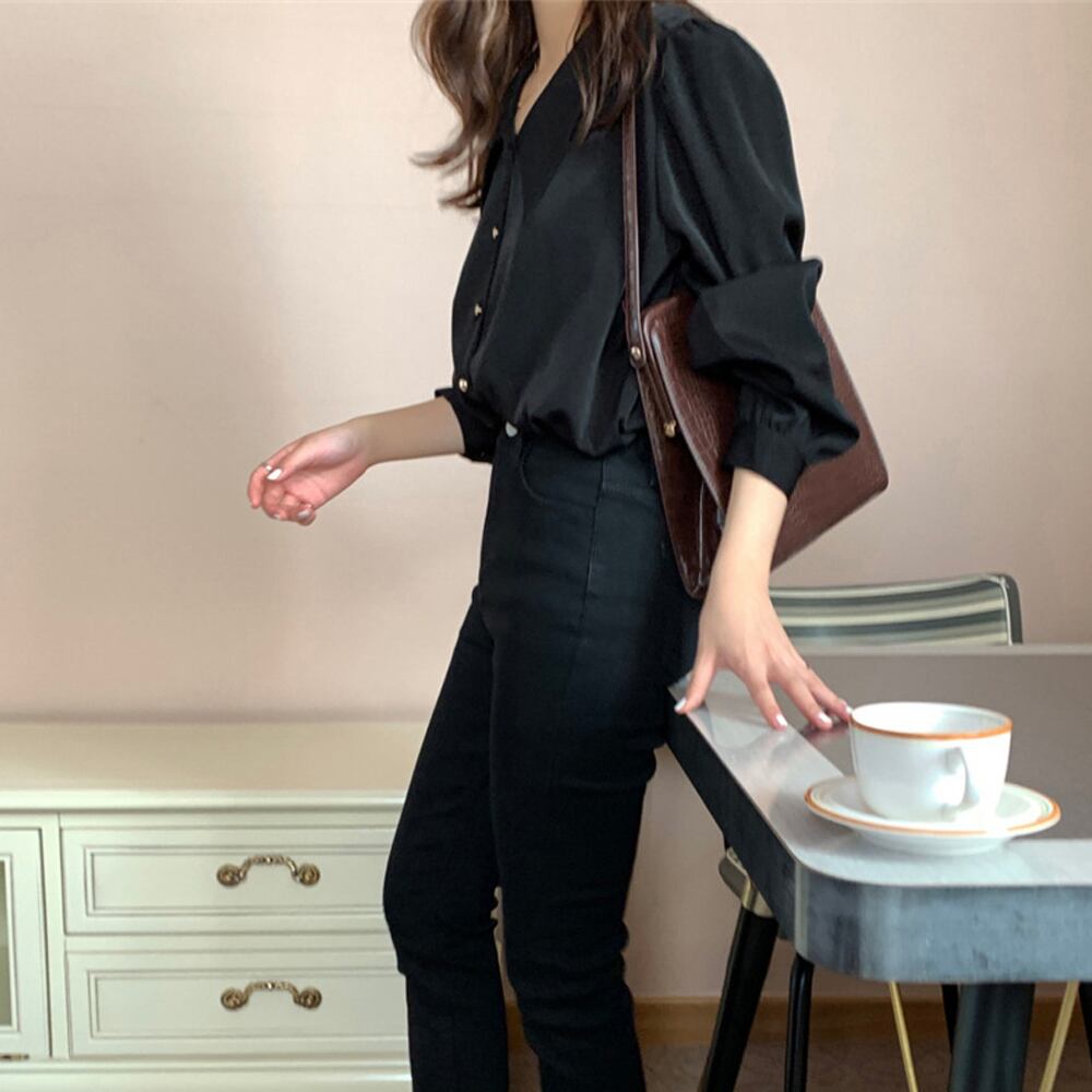 Vネックシャツ春秋 前開きトップス オフィスブラウス