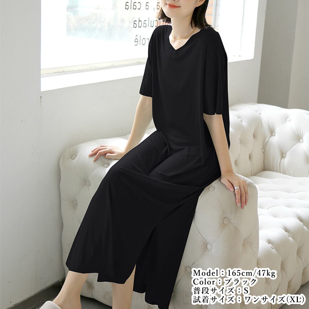 ルームウェア 体型カバー レディース ひんやり 夏パジャマ tシャツワンピ 薄手 部屋着 細めリブ 半袖 スリット入り