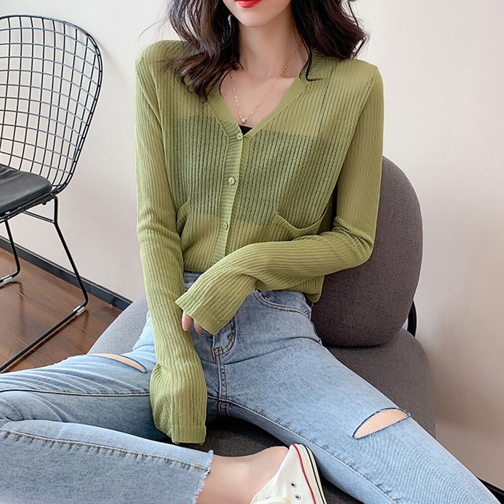 レディース UV 紫外線対策 Vネック 羽織トップス 着やせ サマーニット 前開き 透け感 長袖 サマーカーディガン