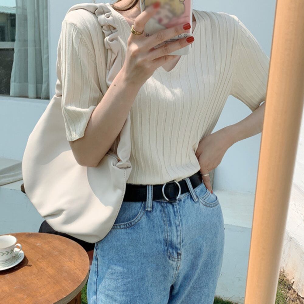ボディコンシャスなリブ編みで美しく見せる広めのVネックサマーニットプルオーバーです