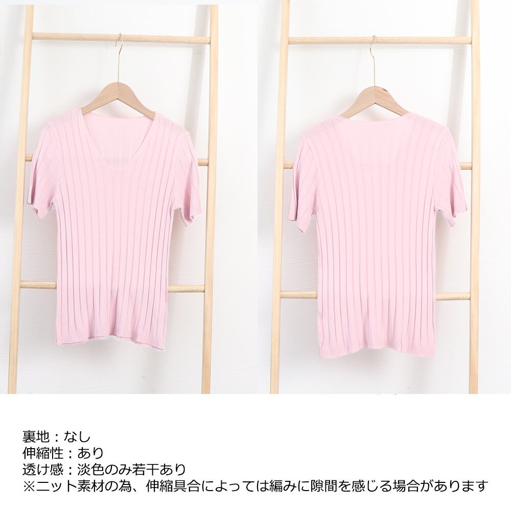 半袖 サマーニット リブ編み ひんやり フィット感 Vネック 夏トップス きれいめ 大人カットソー 冷感タッチ 柔らかい