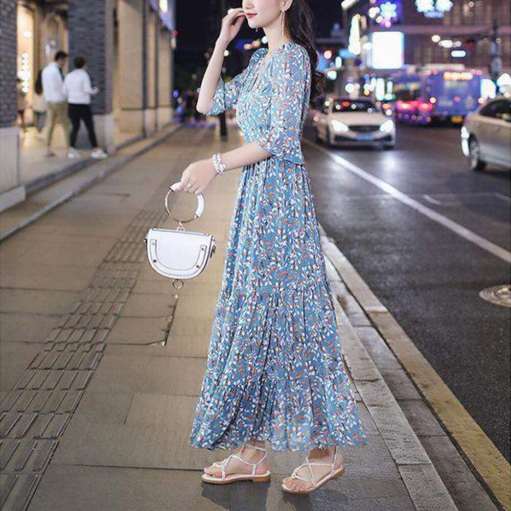 花柄 シフォンワンピース 7分袖 韓国風