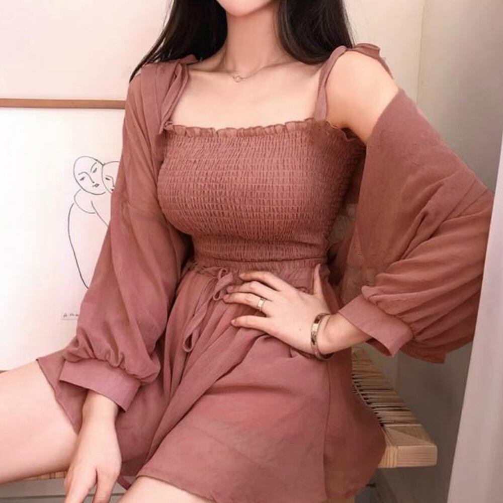 韓国薄手 シアーカーディガン ギャザーキャミソール ショートパンツ 上下セット 透け感シャツ ボリュームスリーブおしゃれ