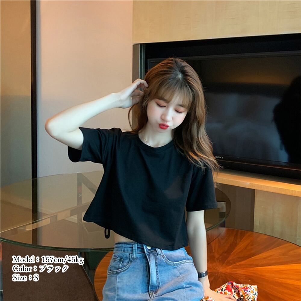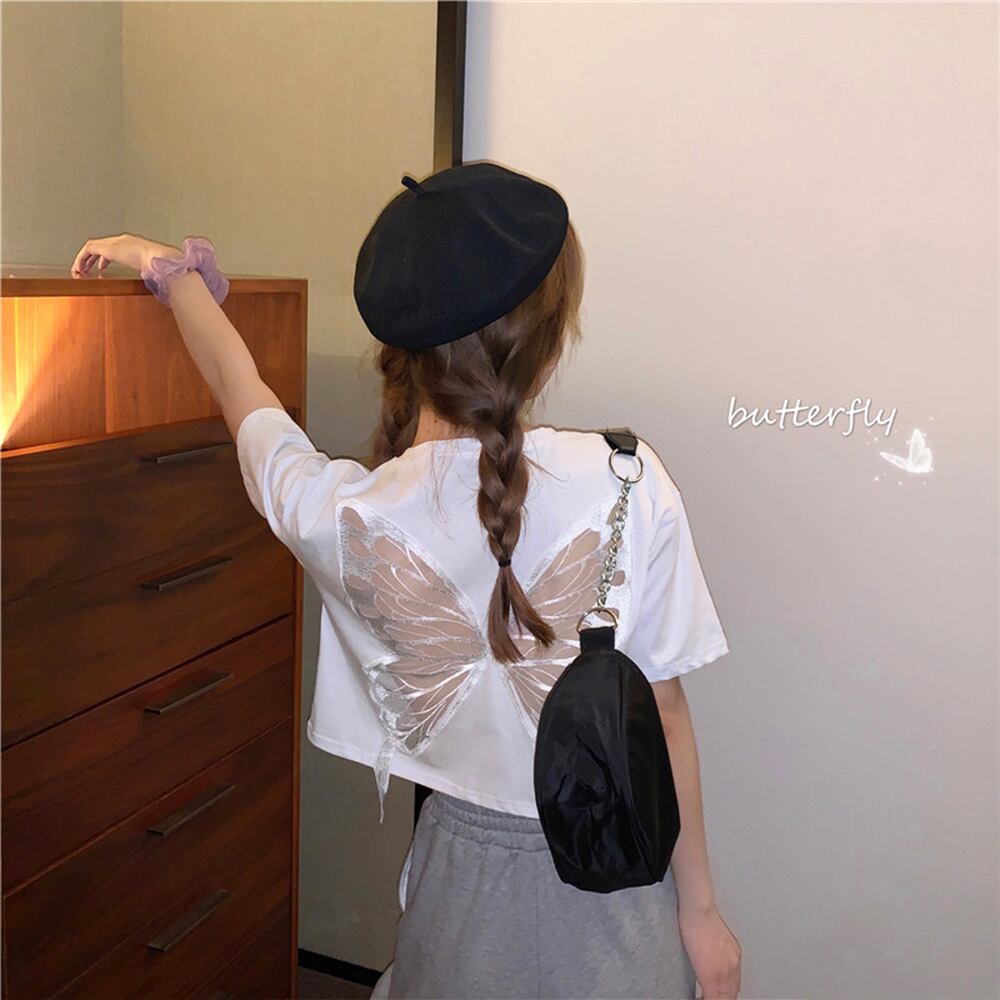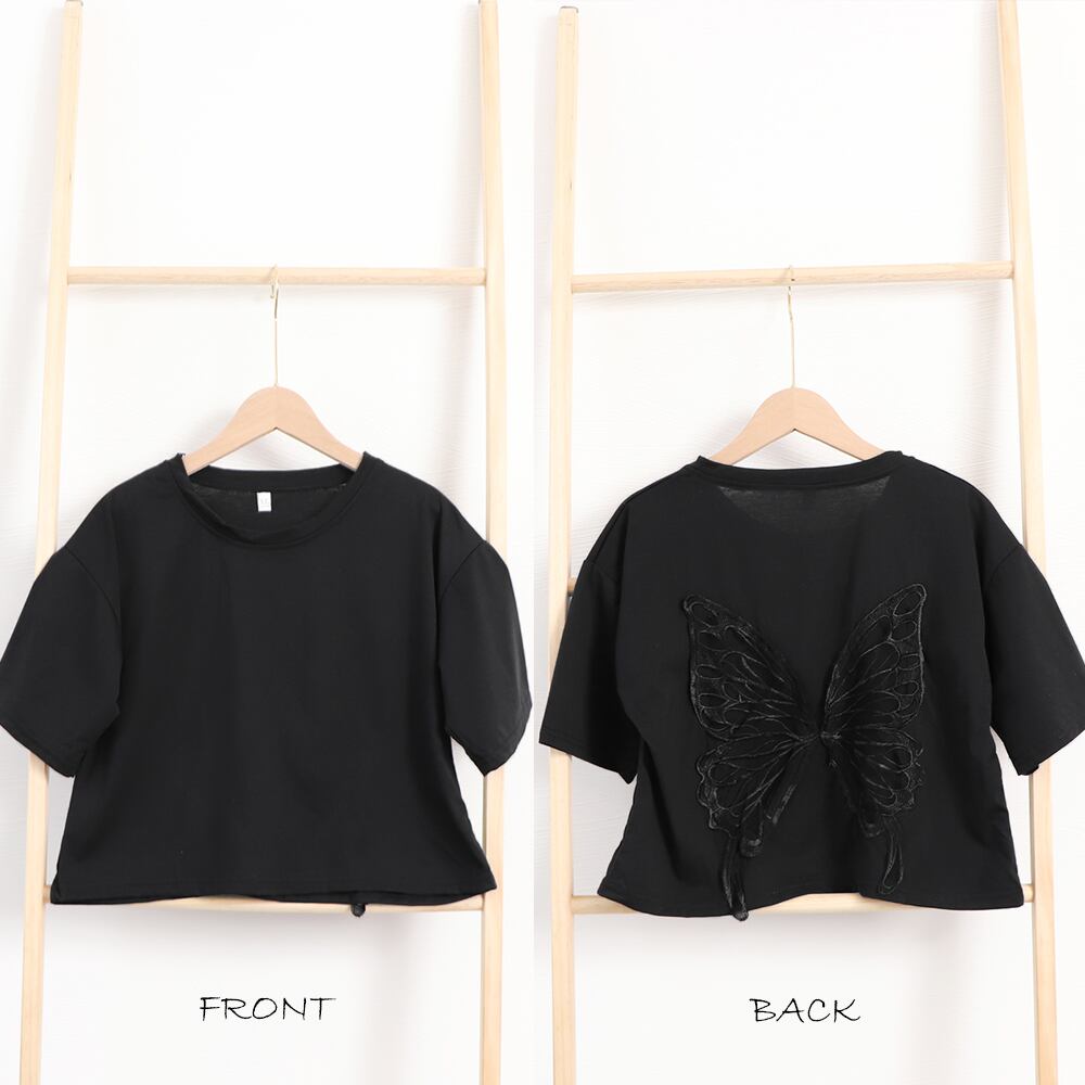 バックシースルー レディース tシャツ クルーネックTシャツ へそ出し 着やせ きれいめ蝶々柄 ミニ丈 可愛い 黒白t