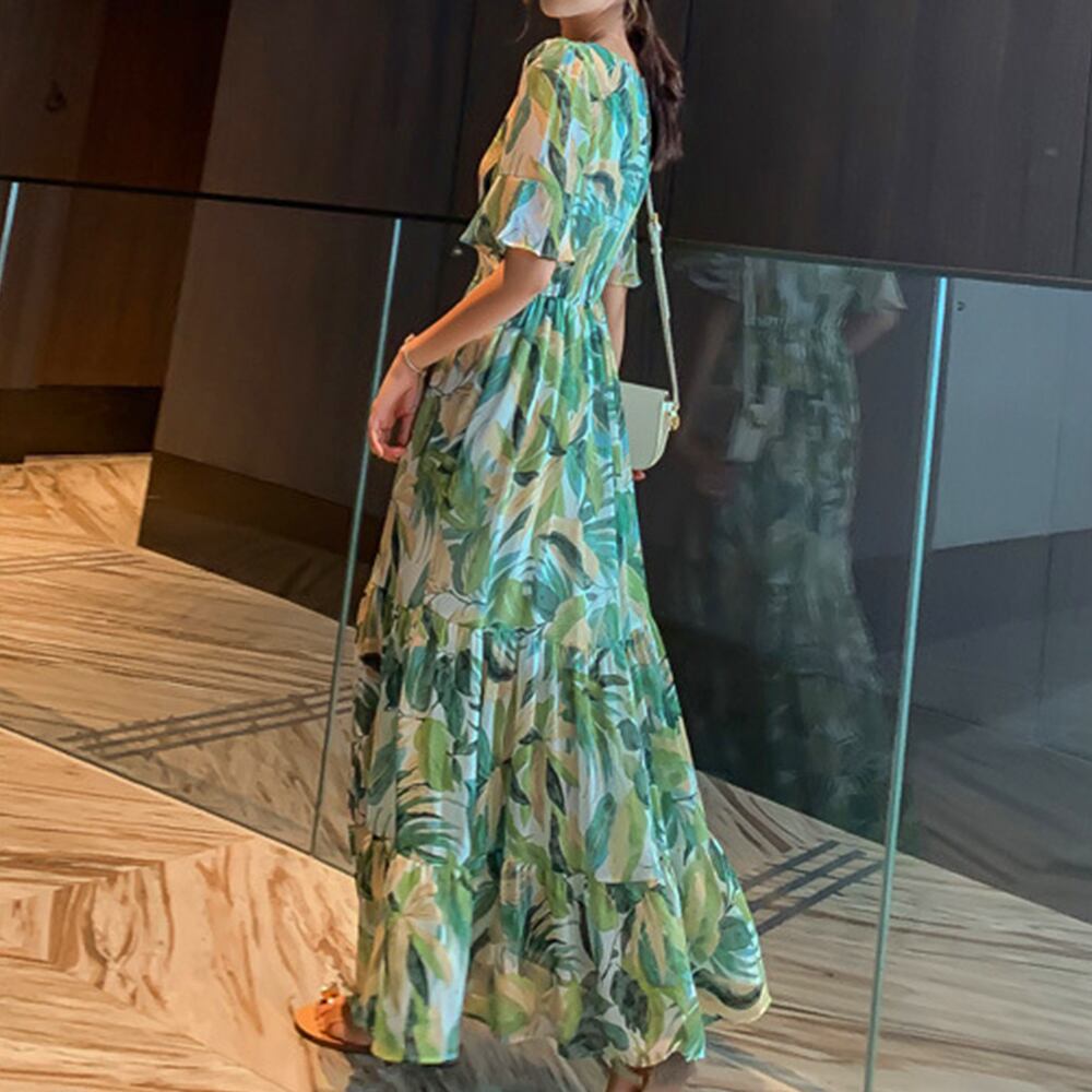 フェミニン カシュクール風 ロングワンピ リゾート ウエストマーク マキシワンピ フレアスリーブ サマーワンピ Aライン