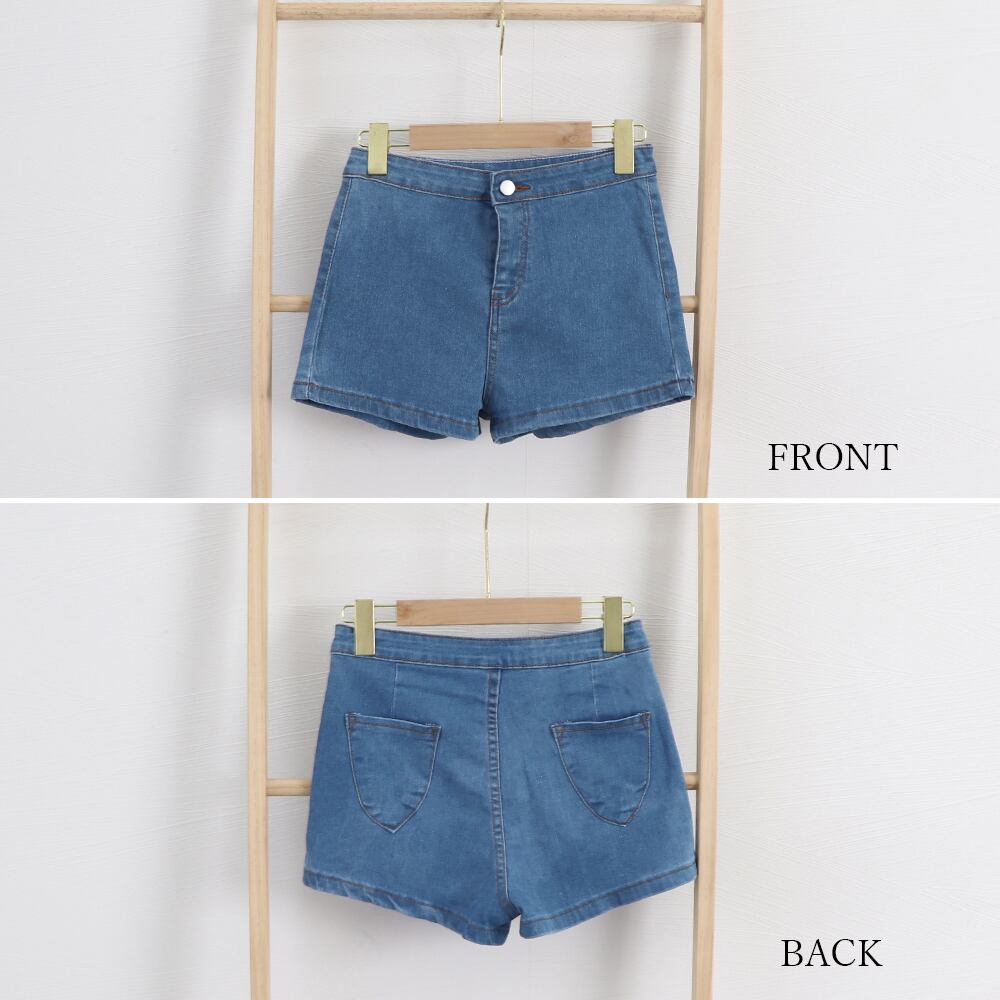 ミニ丈のハイウエスト仕様で、自然なスタイルアップをかなえるデニムショートパンツ