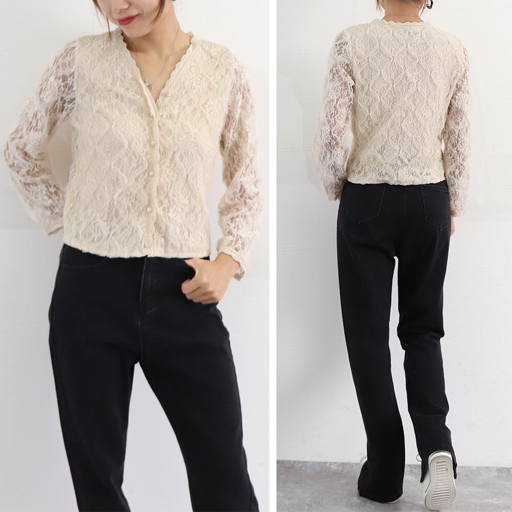 レースブラウス レディース九分袖Vネック