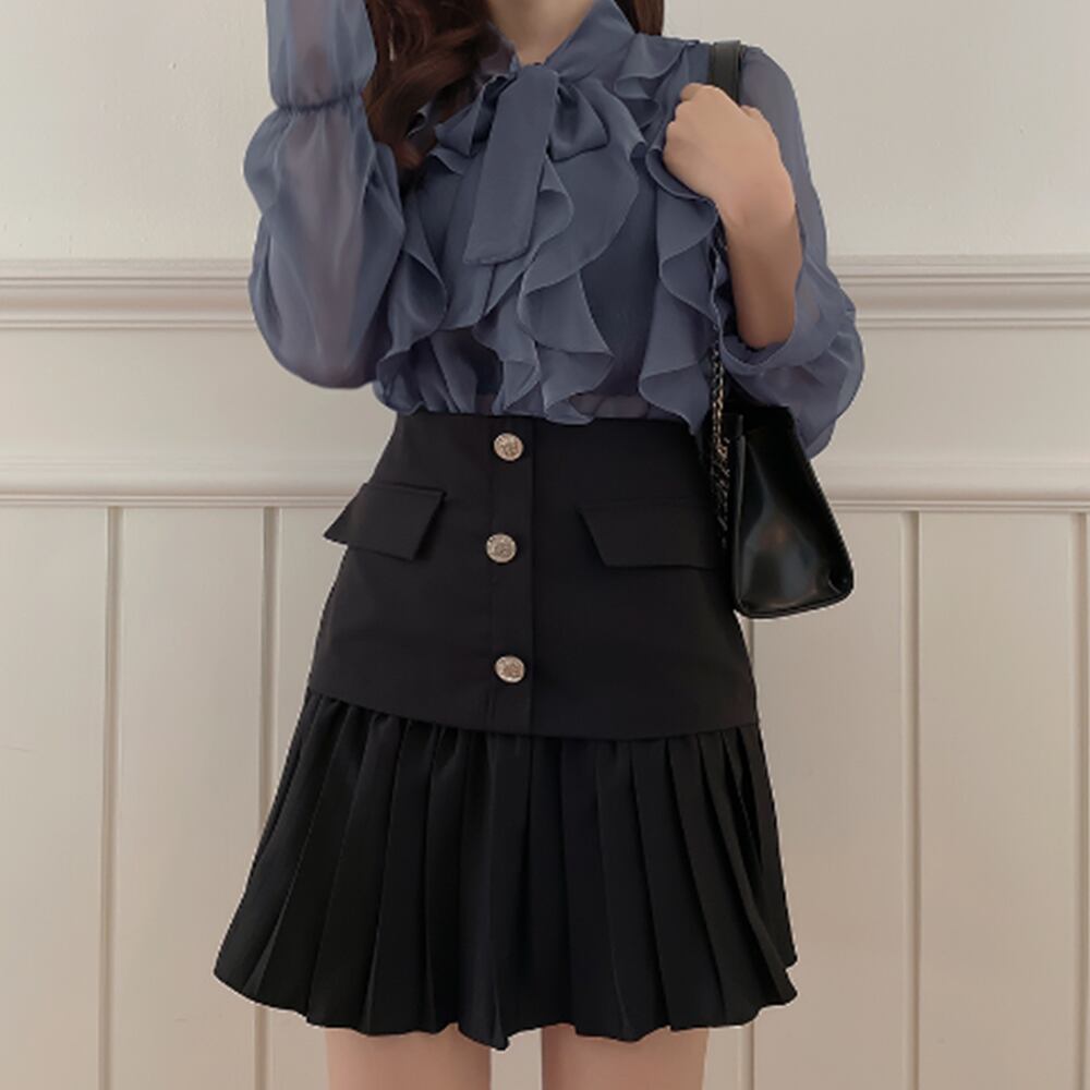 夏らしい清涼感と軽やかさを出しつつ、大人の女性らしい上品な雰囲気に仕上げてくれるフリルシアーブラウス