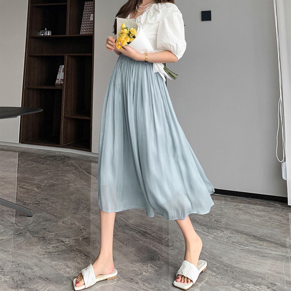 大人可愛い 体型カバー サテン風スカート ウエストゴム 春夏 ミモレスカート ハイウエストふんわり 無地ボトムス 光沢感