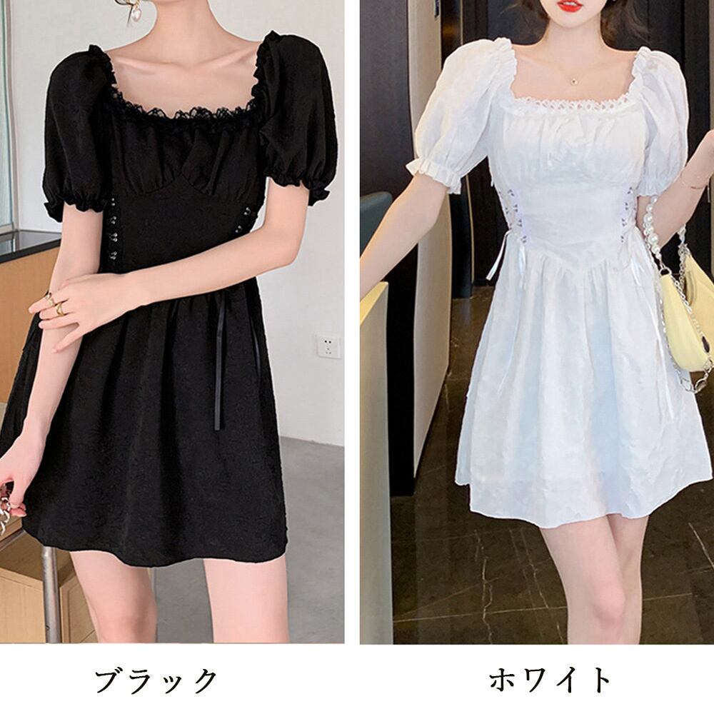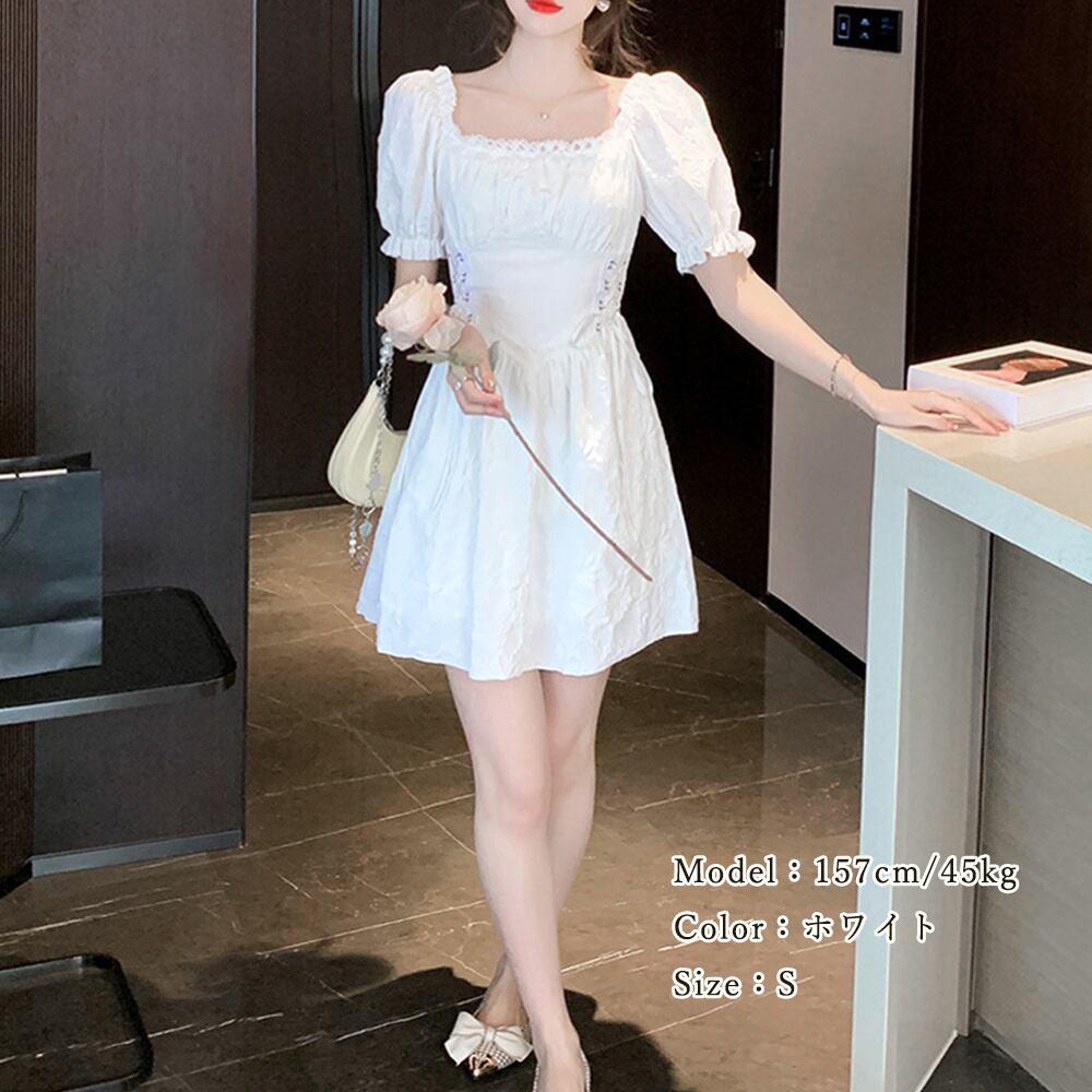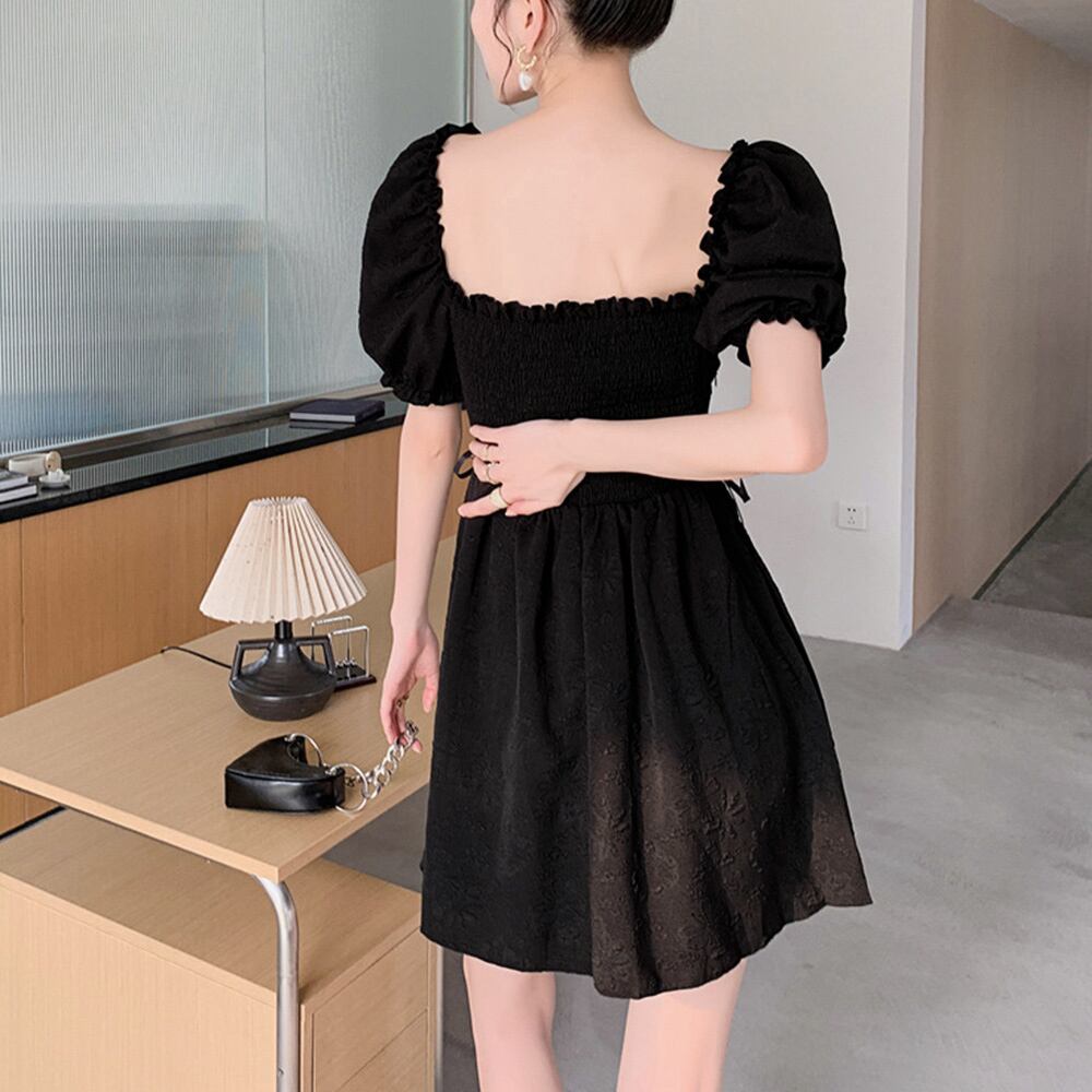 スクエアネック ミニワンピース無地パフ袖