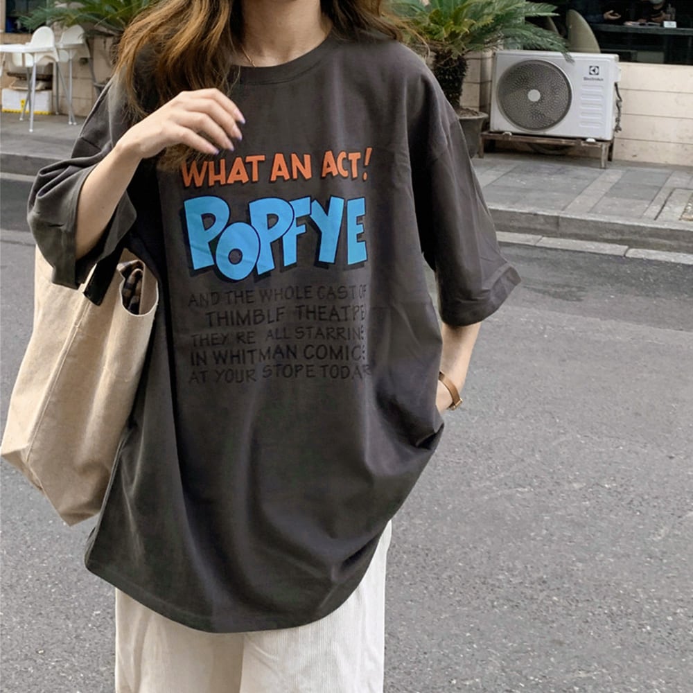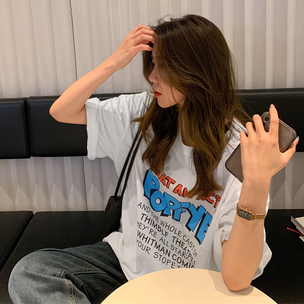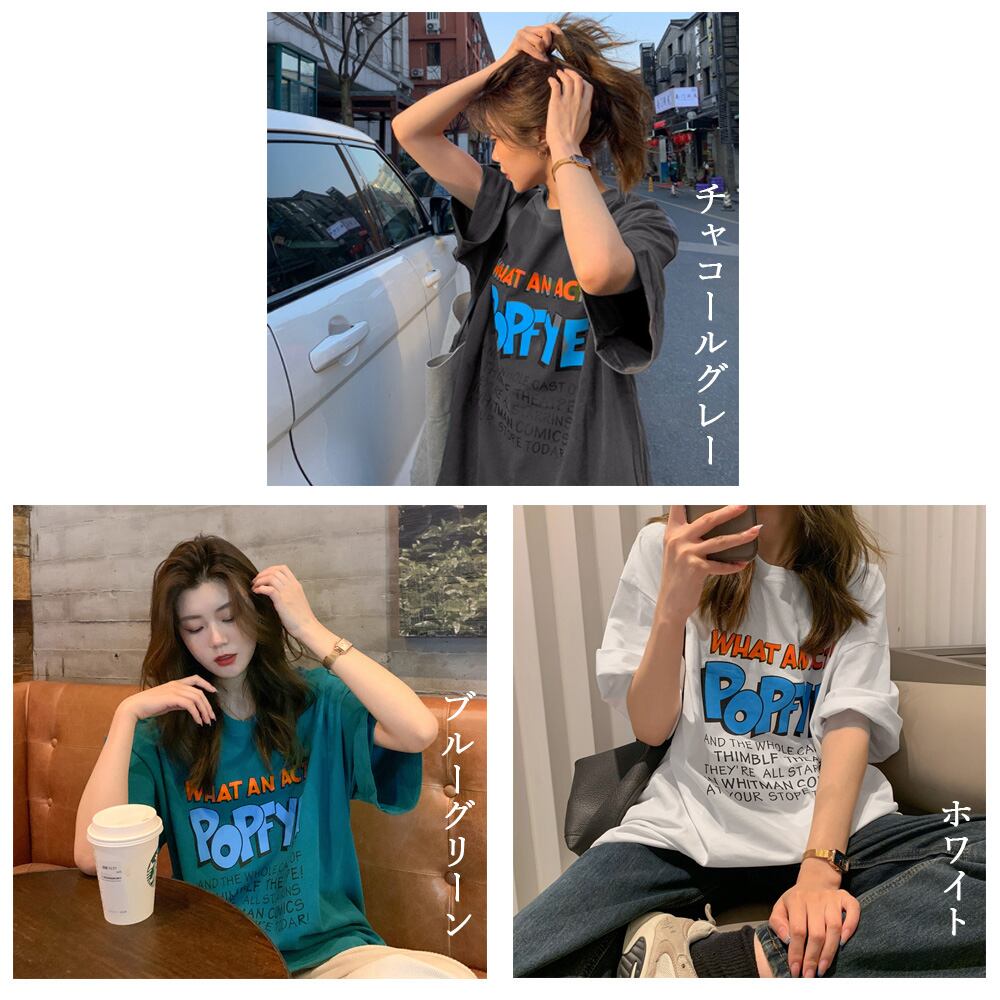 トップス ルーズ 英字ロゴ ロングTシャツ 着やせ 体型カバー プリントTシャツ 半袖 オルチャン 韓国ファッション夏服