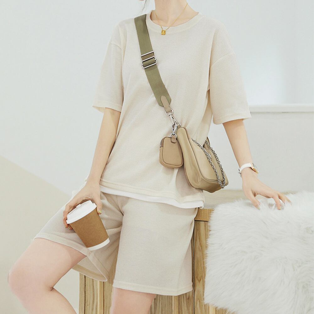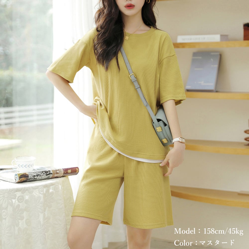 無地半袖 カットソーTシャツ ショートパンツ 2点セット サマー韓国カジュアル 部屋着ワッフルルームウェア スウェット