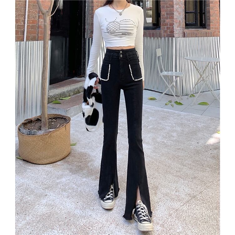 オールシーズン着用できるハイウエストのデニムパンツ。クールで可愛いデザインとポケットを縁取る装飾が特徴的。