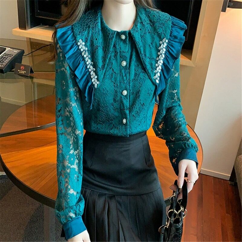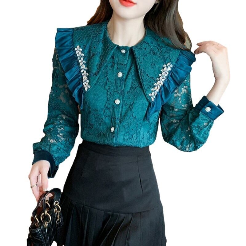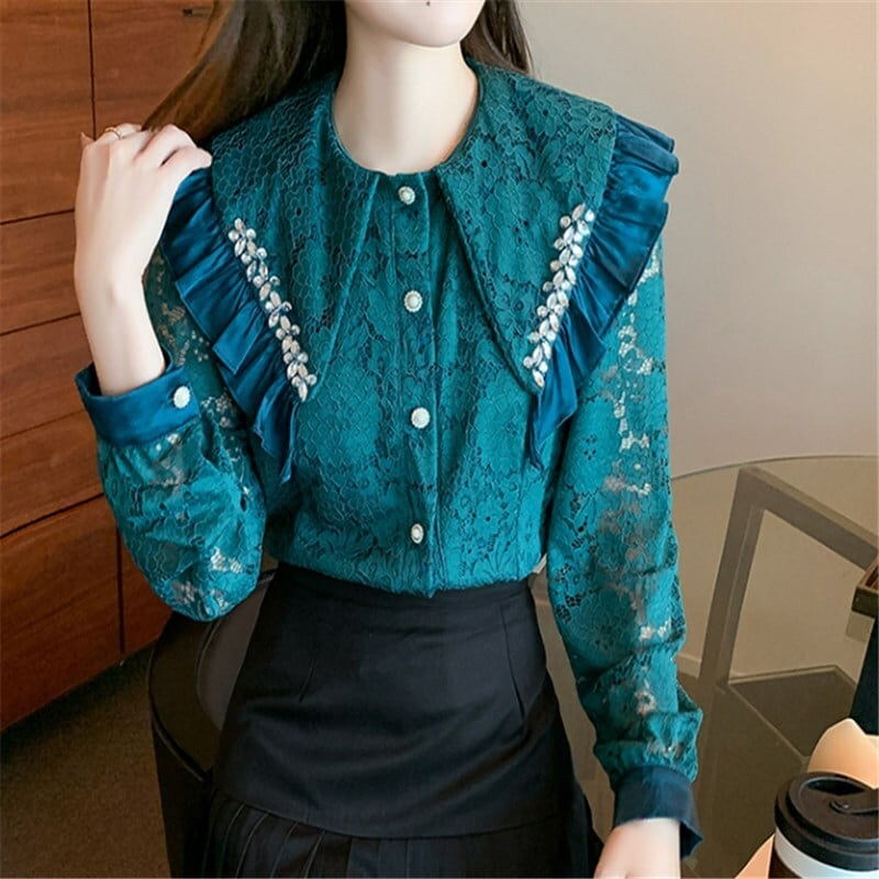 トップス ブラウス 袖あり 長袖 襟付き ビーズ スリム 細身 レース フリル 前開き 透け感 かわいい 大人可愛い きれいめ 大人 上品 おしゃれ お洒落 華やか 大人女子 ラブリー キュート ガーリー クール セクシー エレガント 主役級 透け感 美しい 花柄 フラワー 春 秋 二次会 10代 20代 30代 レディース 女性用 OL 通勤 デート お出かけ 女子会 休日 パーティー イベント リゾート 旅行 海 ガーデン レストラン ショッピング 韓国系 S M L XL 色展開 緑 グリーン