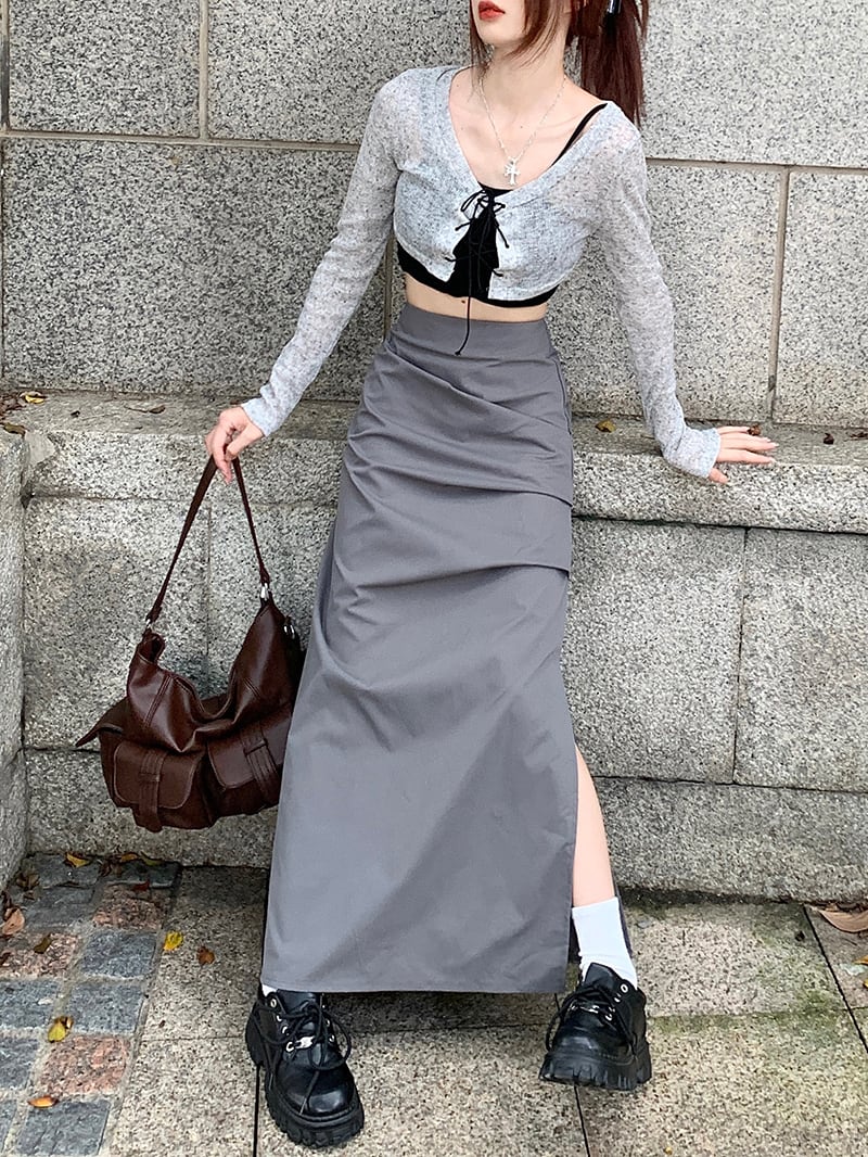 スカート ボトムス ロングスカート ミモレ ミモレ丈 ストレート Aライン スマート スリット サイドスリット ハイウエスト 大人可愛い シンプル カジュアル おしゃれ お洒落 かっこいい レトロ 大人女子 クール 柄 レディース 女性用 デート お出かけ 女子会 お泊まり 休日 イベント 普段使い ファッション コーデ スタイル サイズ S M L 黒 ブラック 灰色 グレー
