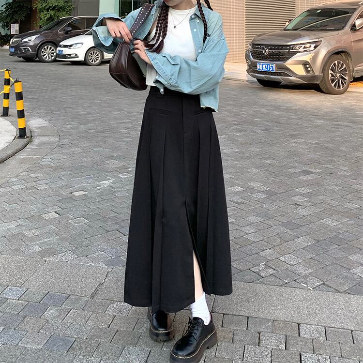 スカート ボトムス ロングスカート プリーツスカート ミモレ ミモレ丈 ロング ロング丈 ストレート Aライン スリット サイドスリット ハイウエスト 大人可愛い カジュアル 大人 おしゃれ お洒落 レトロ 大人女子 無地 10代 20代 レディース 女性用 デート お出かけ 女子会 お泊まり 休日 イベント ファッション コーデ スタイル サイズ S M L 黒 ブラック 灰色 グレー