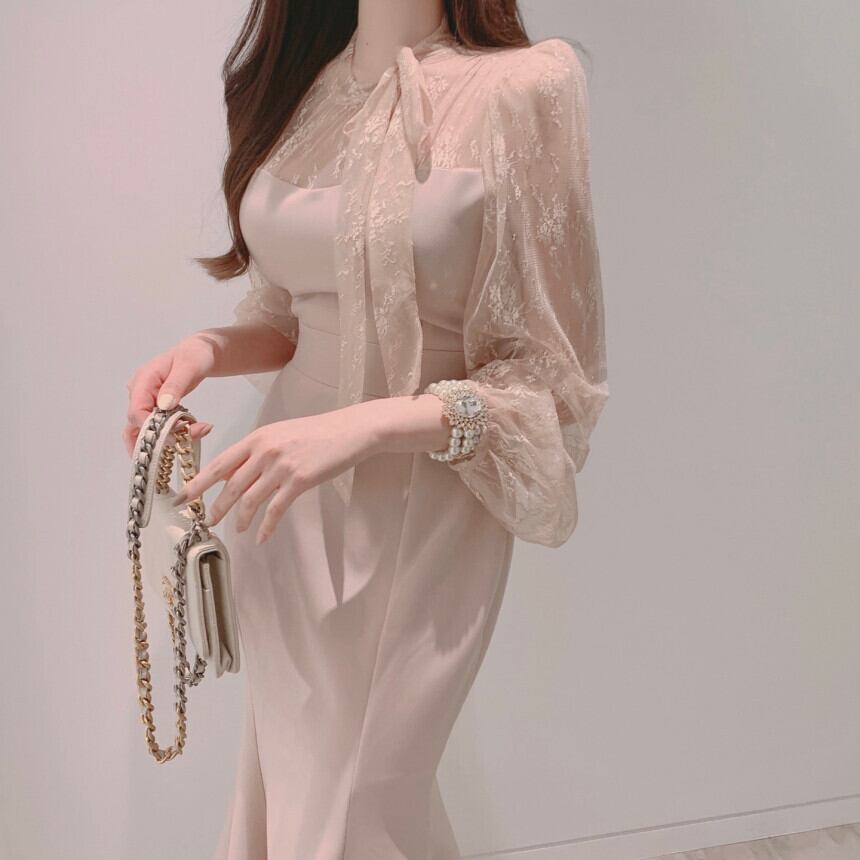 ドレス パーティードレス 膝下 ミモレ ミモレ丈 袖あり ラウンドネック マーメイド マーメイドライン スリム 細身 レース リボン 大人可愛い きれいめ シンプル おしゃれ お洒落 セクシー フォーマル 華やか 無地 無地 10代 20代 レディース 女性用 デート お出かけ 女子会 パーティー イベント 春 秋 ブライダル 二次会 お呼ばれ パーティー S M 色展開 黒 ブラック ピンク
