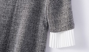 ラウンドネックで襟なし、細身のシルエットが印象的。