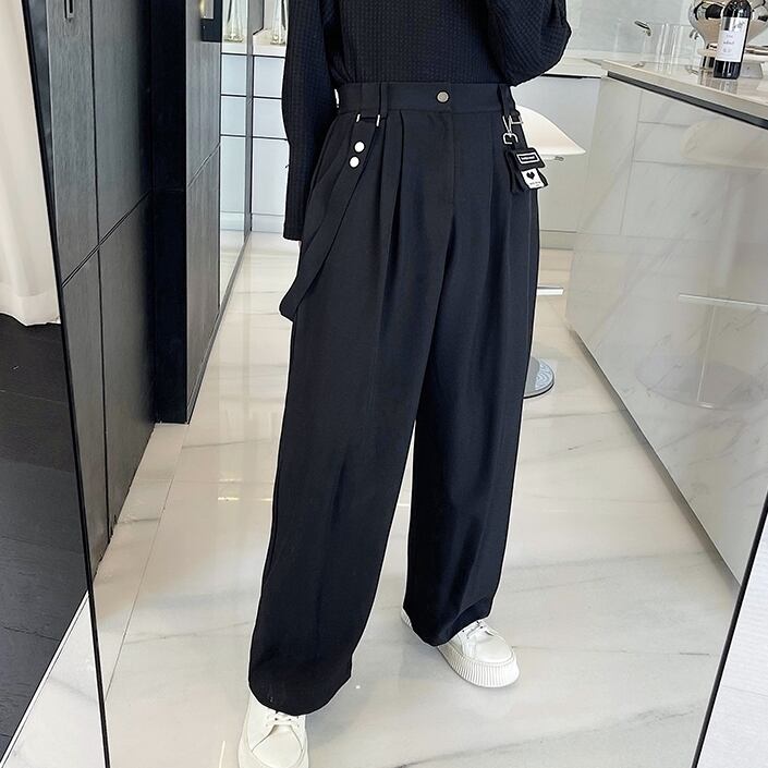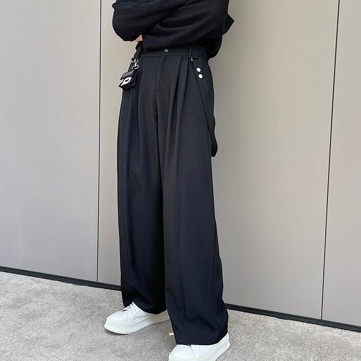 ボトムス パンツ ワイドレッグパンツ モップパンツ ロング ロング丈 ストレート ワイド スマート ドレープ 肩紐 薄手 シンプル カジュアル おしゃれ お洒落 かっこいい レトロ ラフ メンズライク マニッシュ ボーイッシュ スポーティー ルーズ クール 無地 春 秋 オールシーズン 10代 20代 30代 メンズ 男性用 学生 デート お出かけ 休日 普段使い 韓国 韓国系 モテ ゆったり 黒 ブラック 大人カラー モノトーン