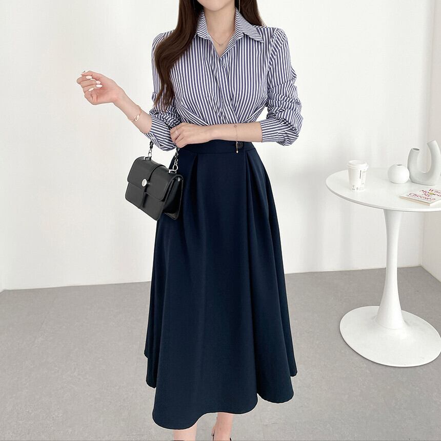 フェイクツーピース スカート ワンピース ロングスカート シャツワンピース ミモレ ミモレ丈 袖あり 長袖 襟付き ストレート Aライン 切り替えデザイン ハイウエスト 大人 上品 おしゃれ お洒落 大人女子 主役級 存在感 柄 ストライプ 春 10代 20代 レディース 女性用 オフィス OL イベント ホテル レストラン ファッション コーデ スタイル フリーサイズ 青 ブルー アプリコット