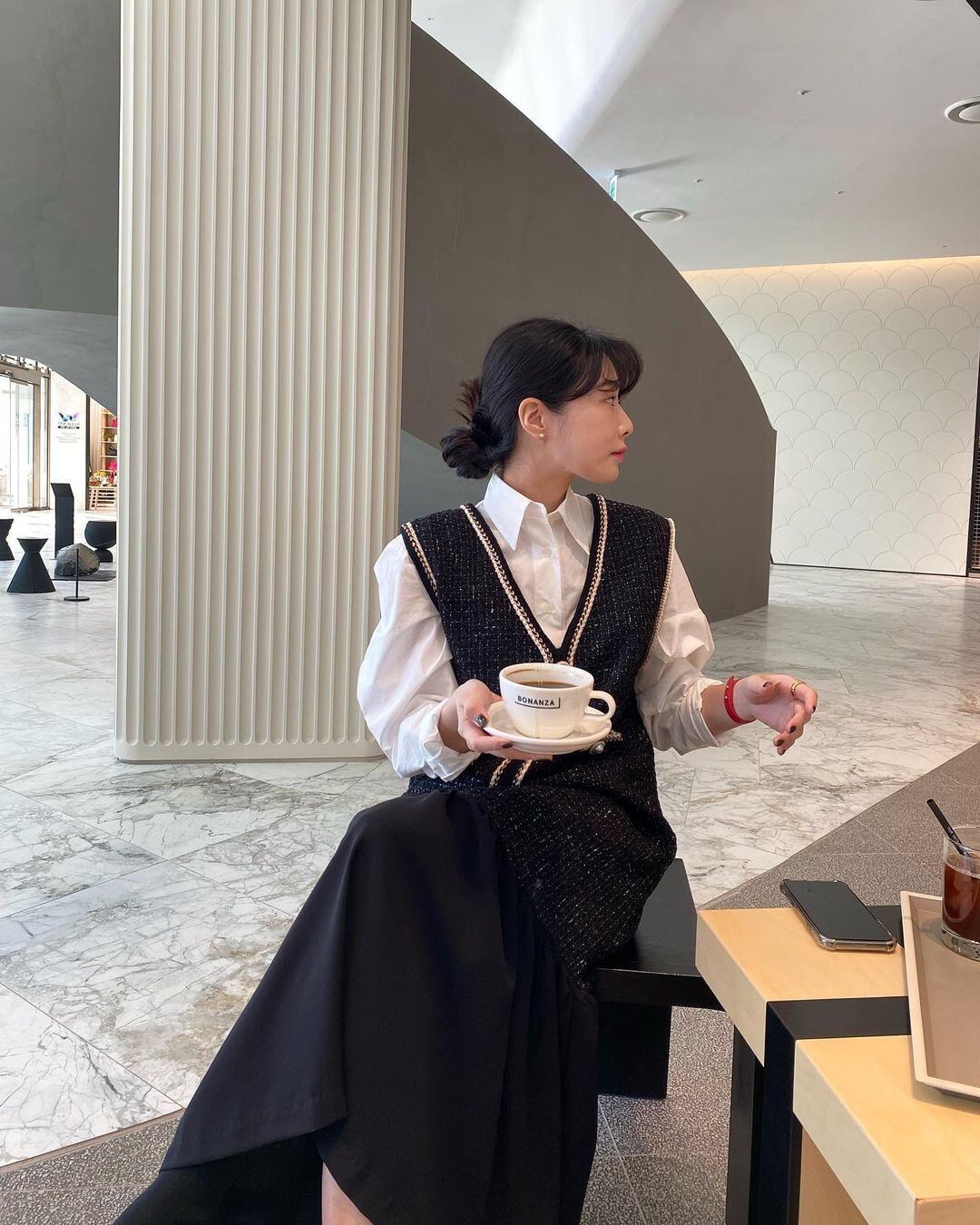 シャツとドレススーツのセットアップ。カジュアルなお洒落さのあるフィッシュテールのスカートが特徴。