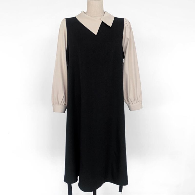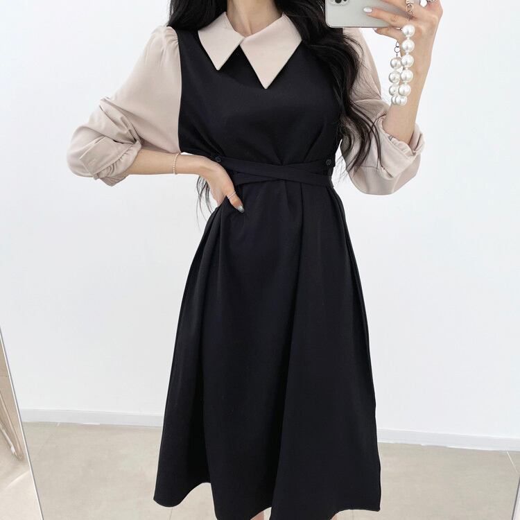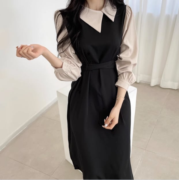 スカート ワンピース プルオーバー ミモレ ミモレ丈 袖あり 長袖 パフスリーブ 襟付き ストレート Aライン 切り替えデザイン ウエストマーク ウエストリボン ハイウエスト 大人 上品 おしゃれ お洒落 モダン 無地 秋 10代 20代 レディース 女性用 オフィス ビジネス 通勤 お出かけ パーティー イベント ホテル レストラン 韓国 ファッション コーデ スタイル サイズ S M L 黒 ブラック